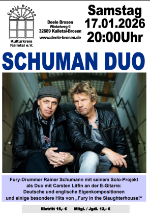 SCHUMAN als Duo mit Carsten Litfin an der E-Gitarre. Mal flächig verspielt, gerne auch handfest…aber immer so wie es die Songs grad brauchen. Ja, die Songs sind das Wichtigste: Mal Englisch, mal Deutsch, aber immer intensiv und geradeaus - und ein paar Fury-Hits sind auch immer mit im Gepäck! ;o)
